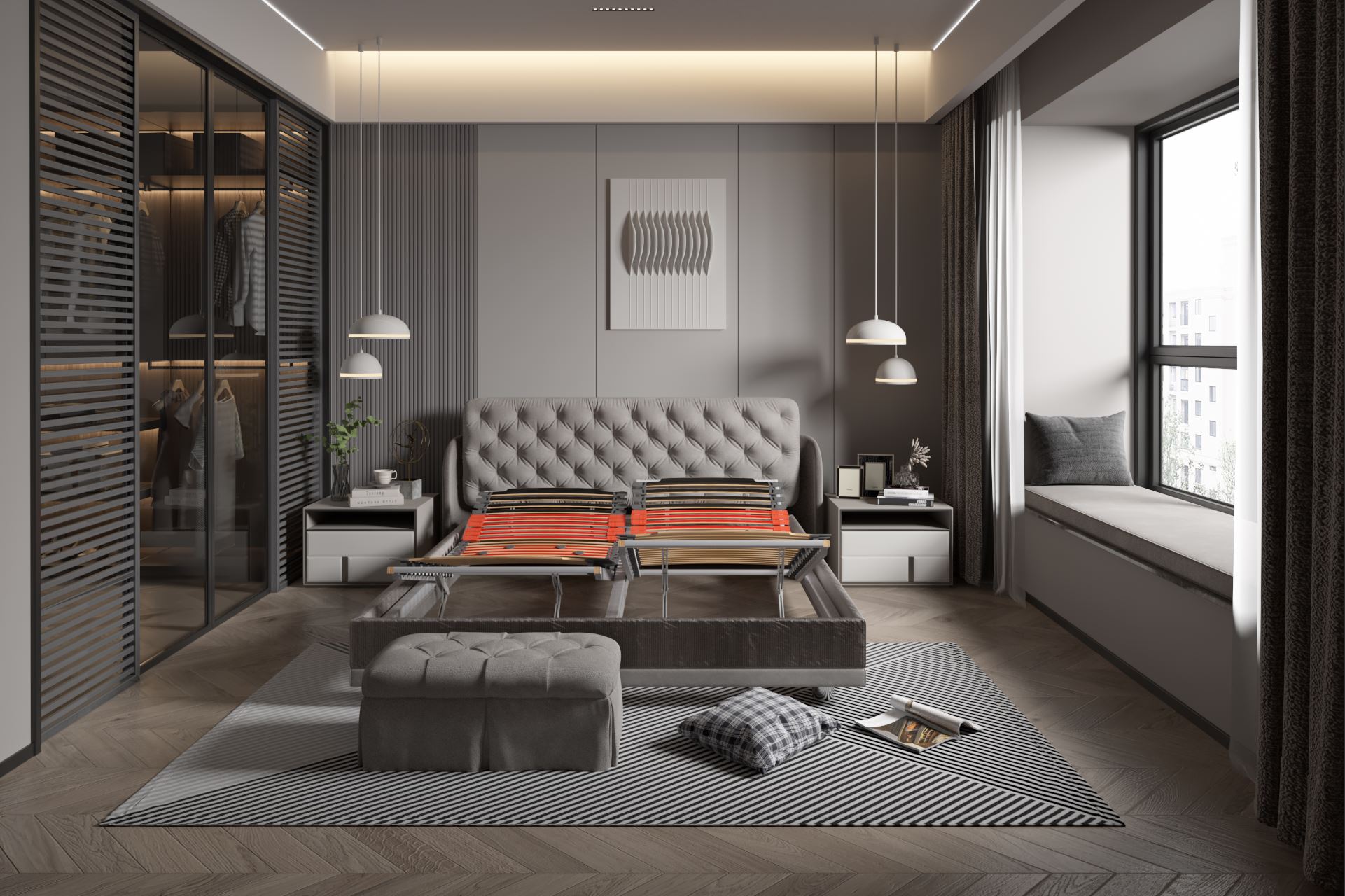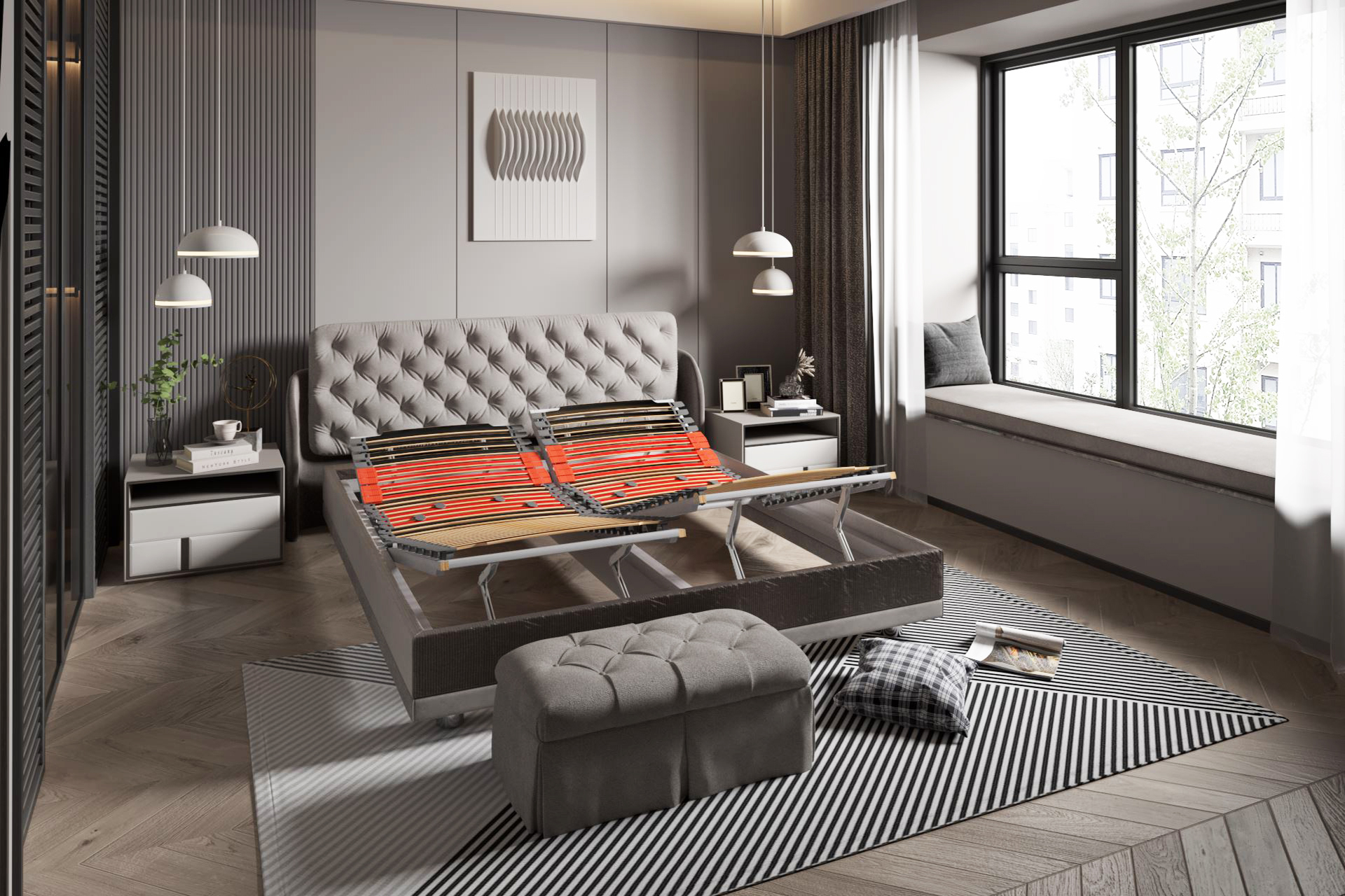 Система от двойни ламели с възможност за индивидуално регулиране на твърдостта в лумбалната зона. Позволява оформяне на персонализирана опора, подобрява подравняването на гръбначния стълб и подпомага по-пълноценния сън.
