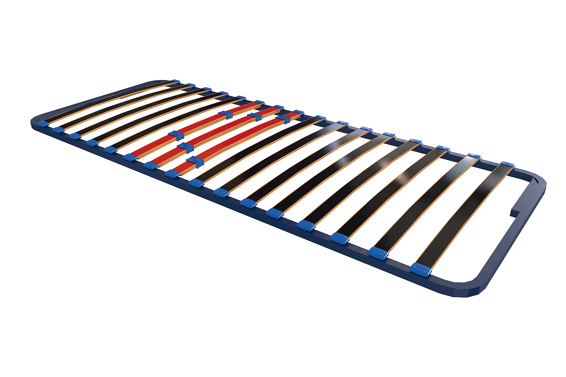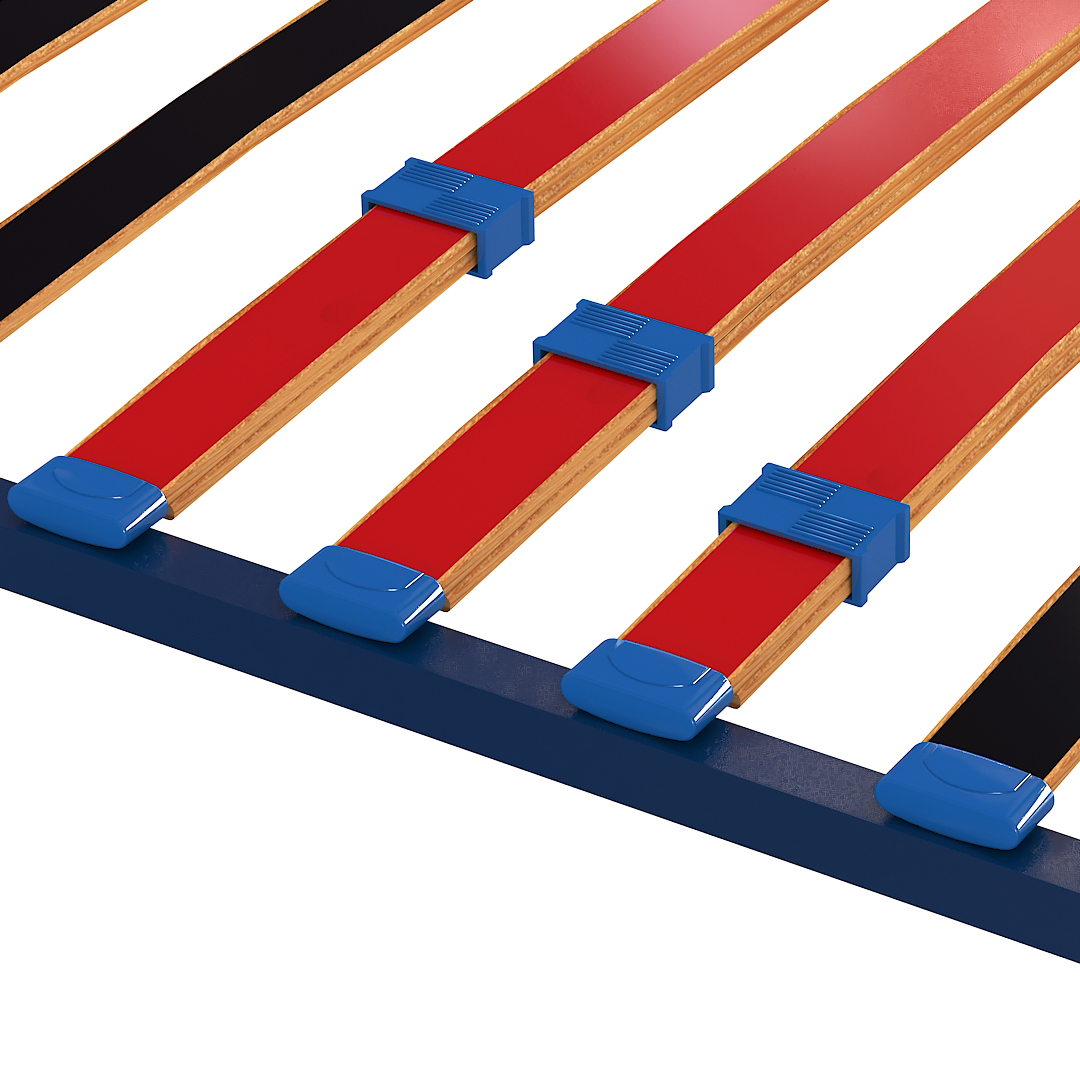 Рамката е конструирана от стабилен стоманен профил, върху който са монтирани обувки от високотехнологичен съполимер с висока устойчивост на усукване и деформация. Ламелите се движат плавно около оста си и следват естествената извивка на тялото, осигурявайки равномерно разпределение на натоварването. Съединяването в средната част е изпълнено без промяна във височината, което създава усещане за изцяло равна и непрекъсната повърхност при всички размери.