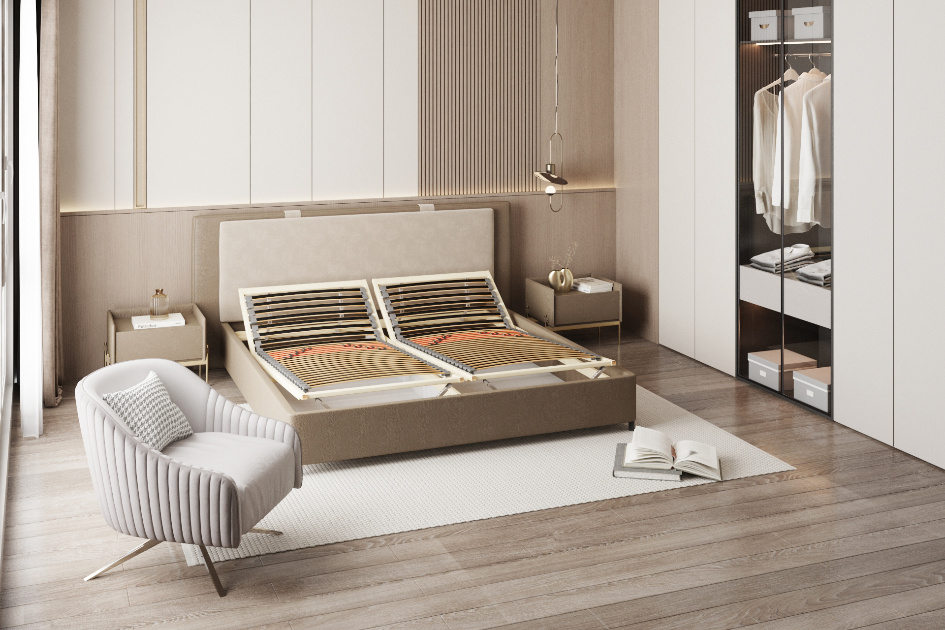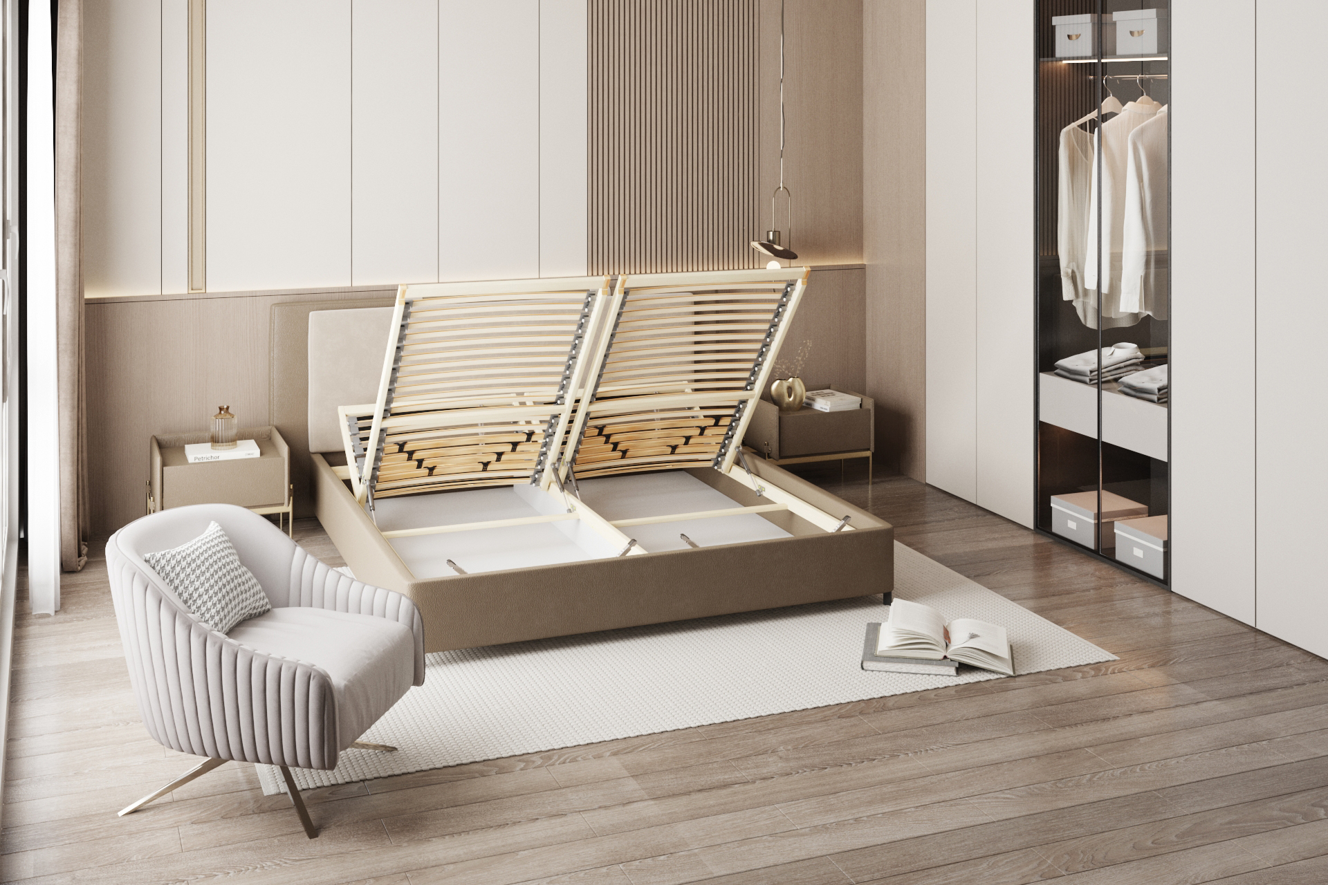 Механизмът гарантира дълготрайна и безшумна употреба, като превръща подматрачното пространство в удобна зона за съхранение на спално бельо, завивки и лични вещи.