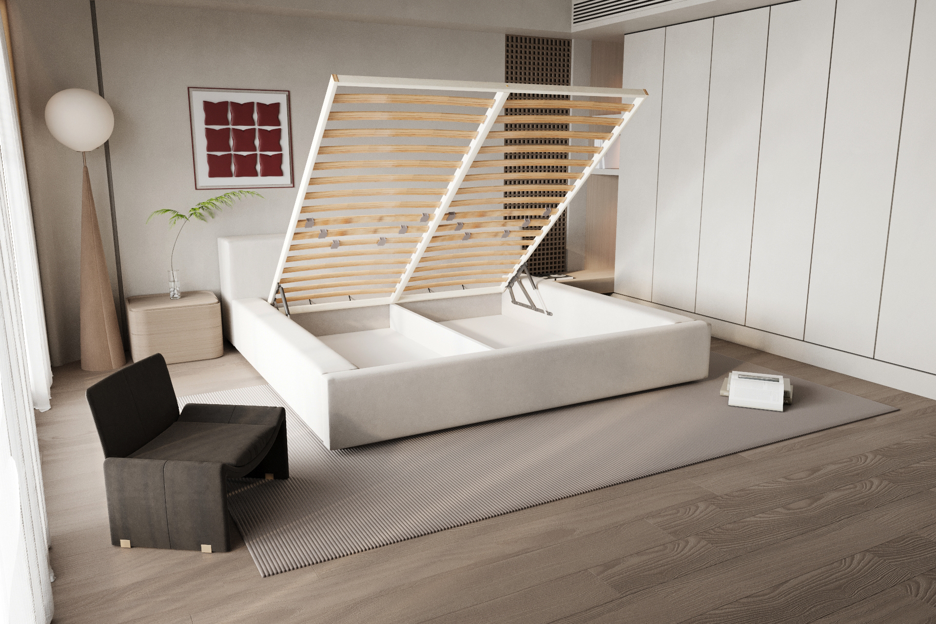 Опцията осигурява отличен достъп до подматрачното пространство, което я прави идеална за съхранение на спално бельо, завивки и лични вещи.