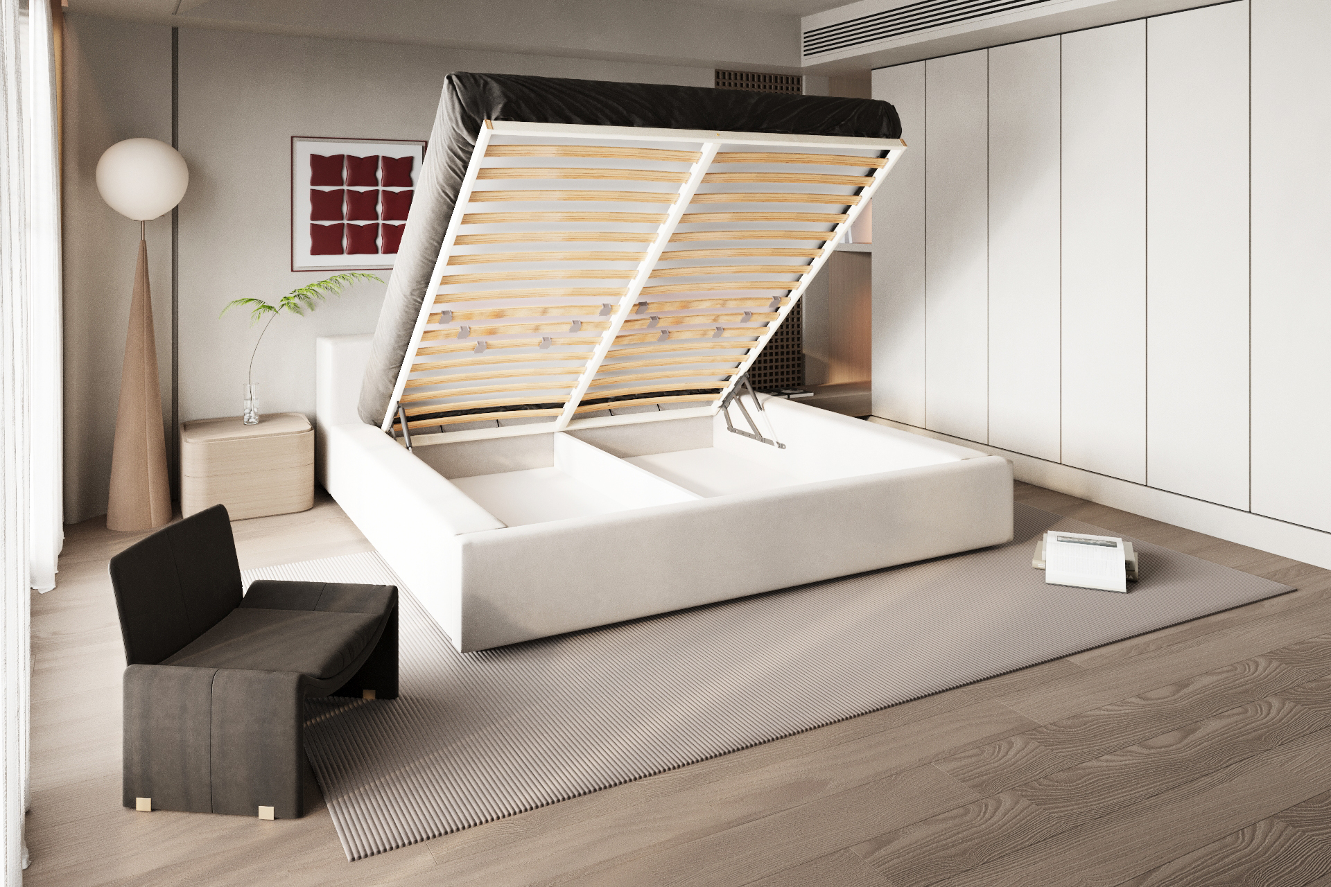 Опция „Ракла“ превръща рамката в практично решение със свободно пространство за съхранение под леглото. Механизмът използва вградени газови амортисьори, които осигуряват плавно и контролирано повдигане на рамката заедно с матрака.
