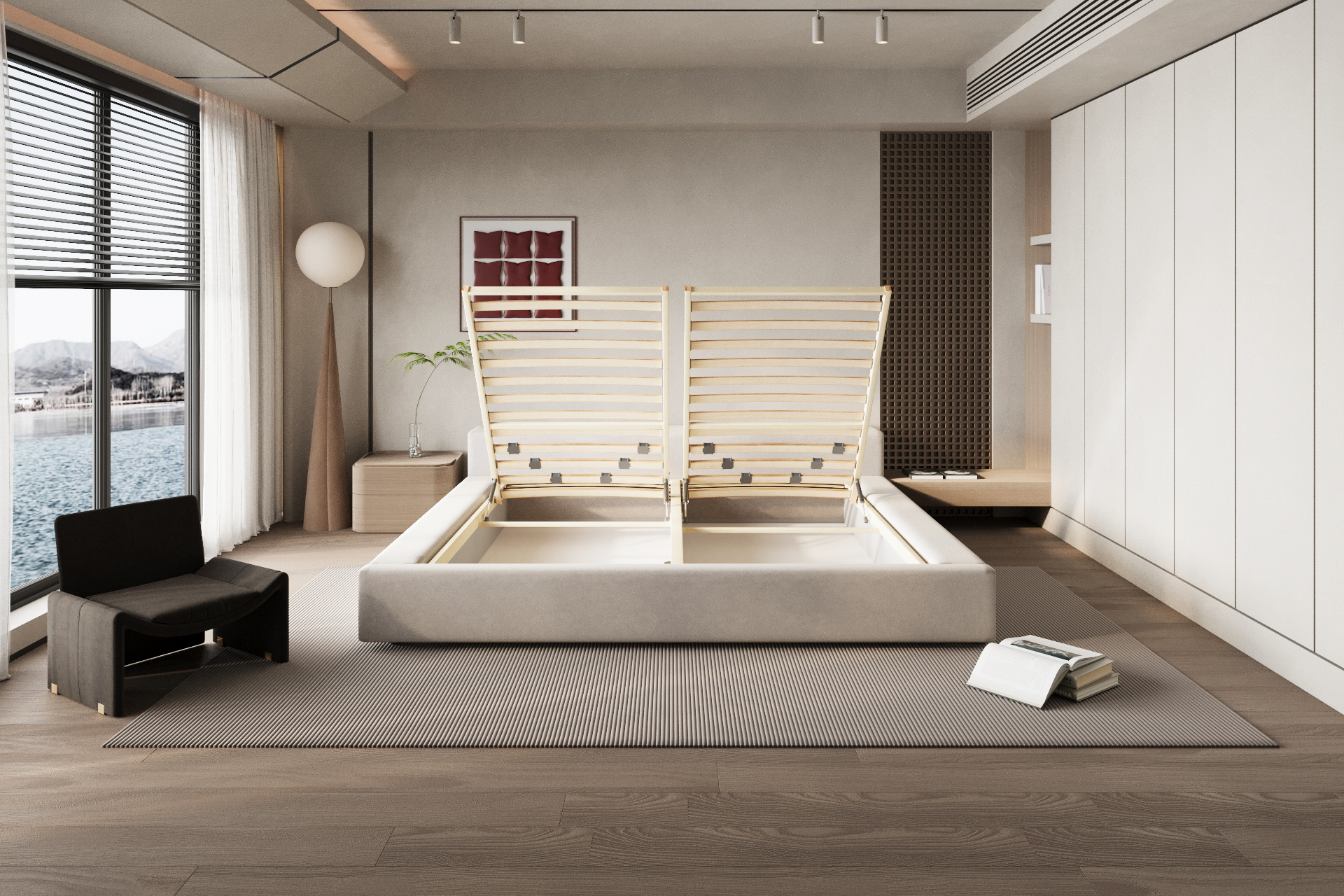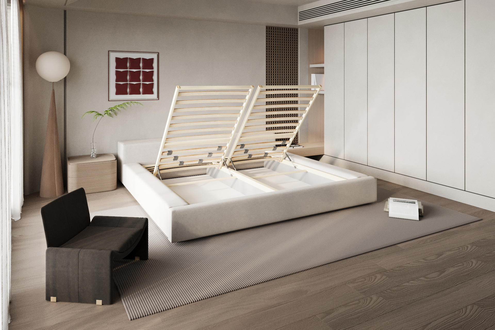 Подходяща за всякакви легла, опцията позволява удобно и равномерно отваряне, като предоставя пълен достъп до подматрачното пространство. Това я прави идеална за съхранение на спално бельо, завивки и лични вещи.