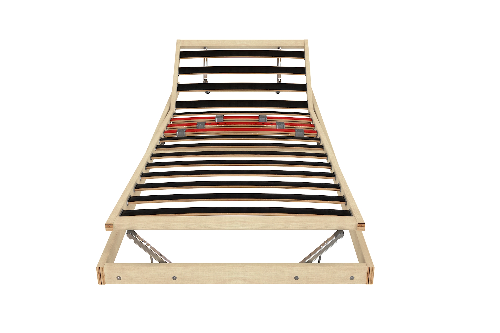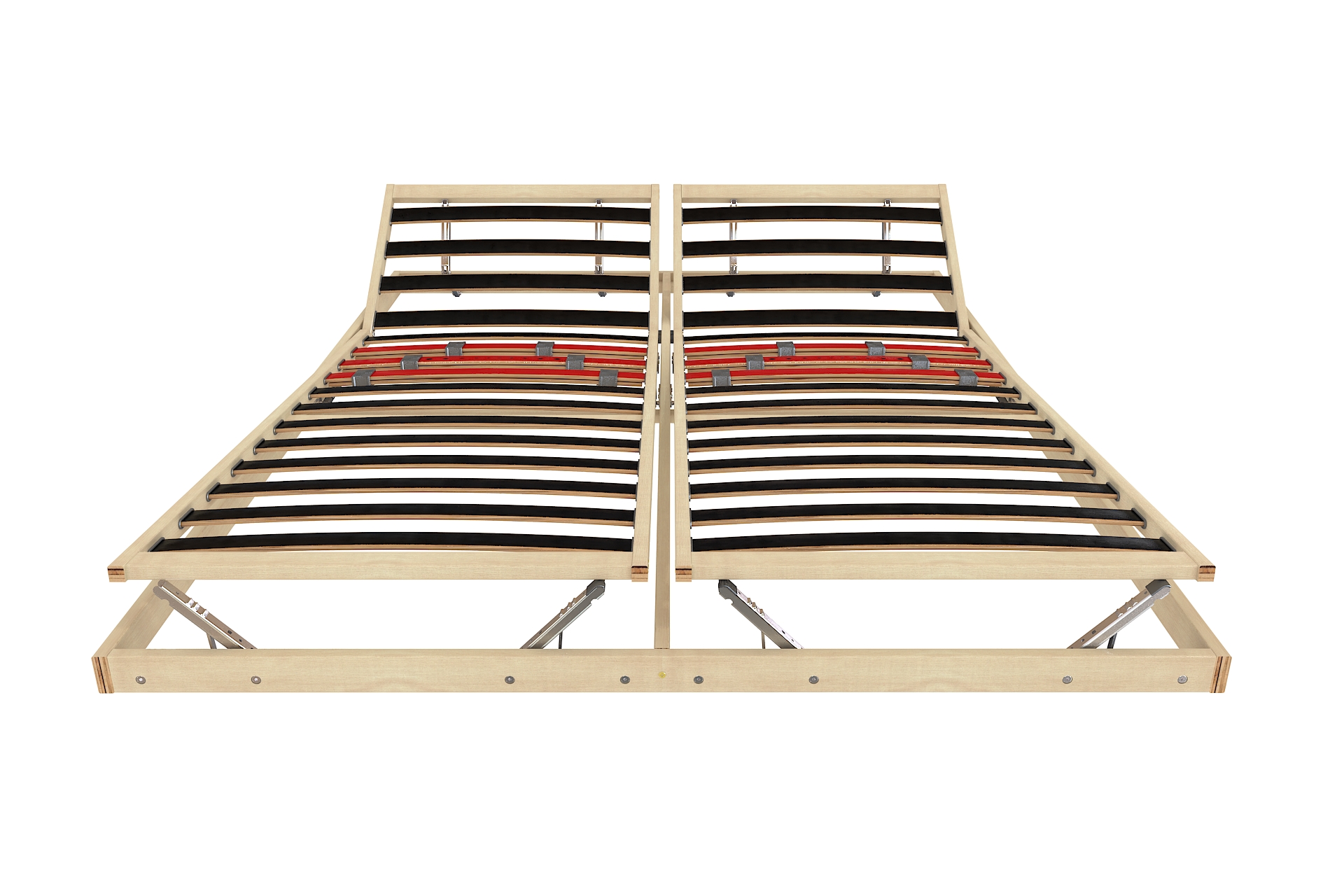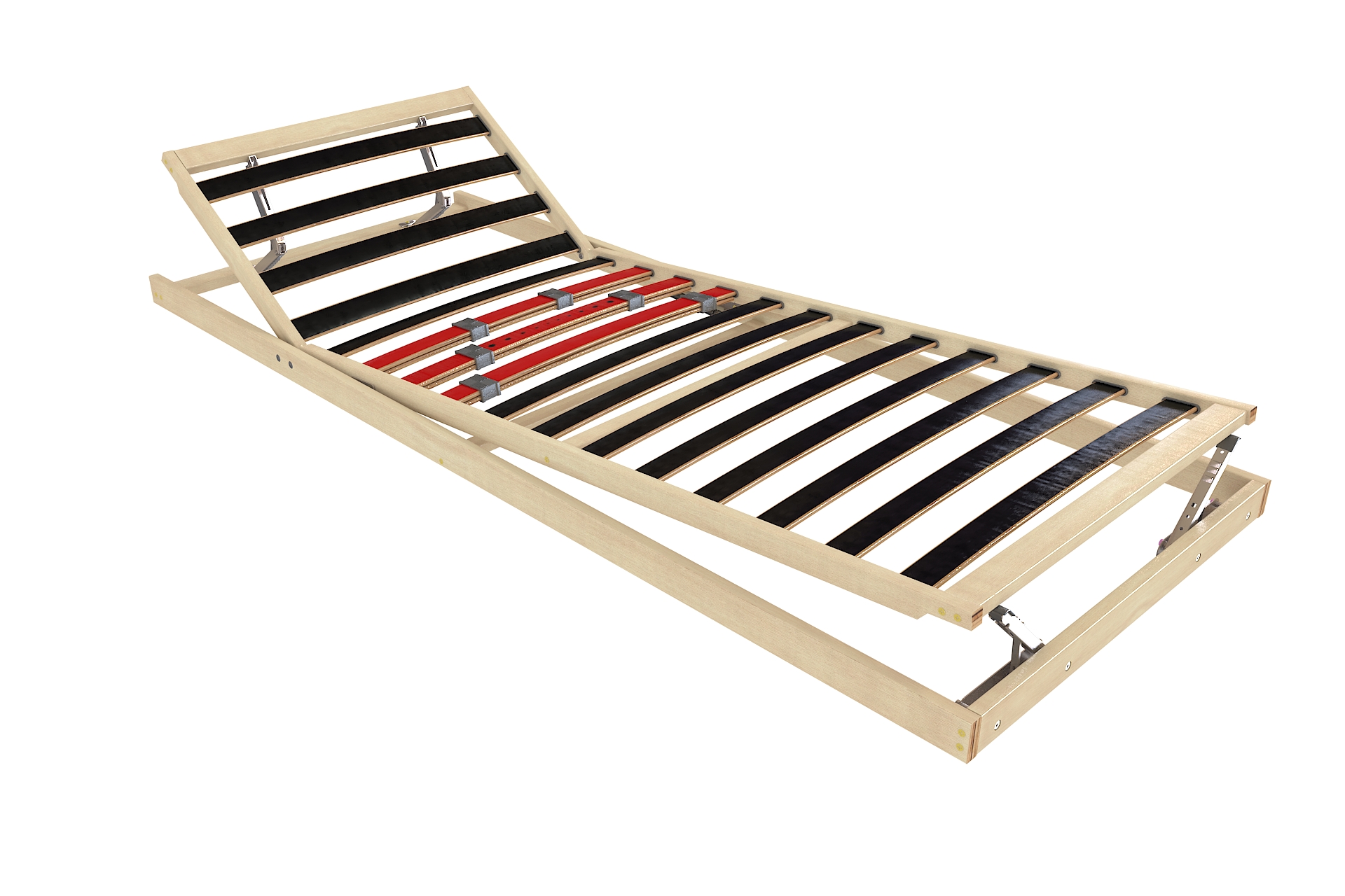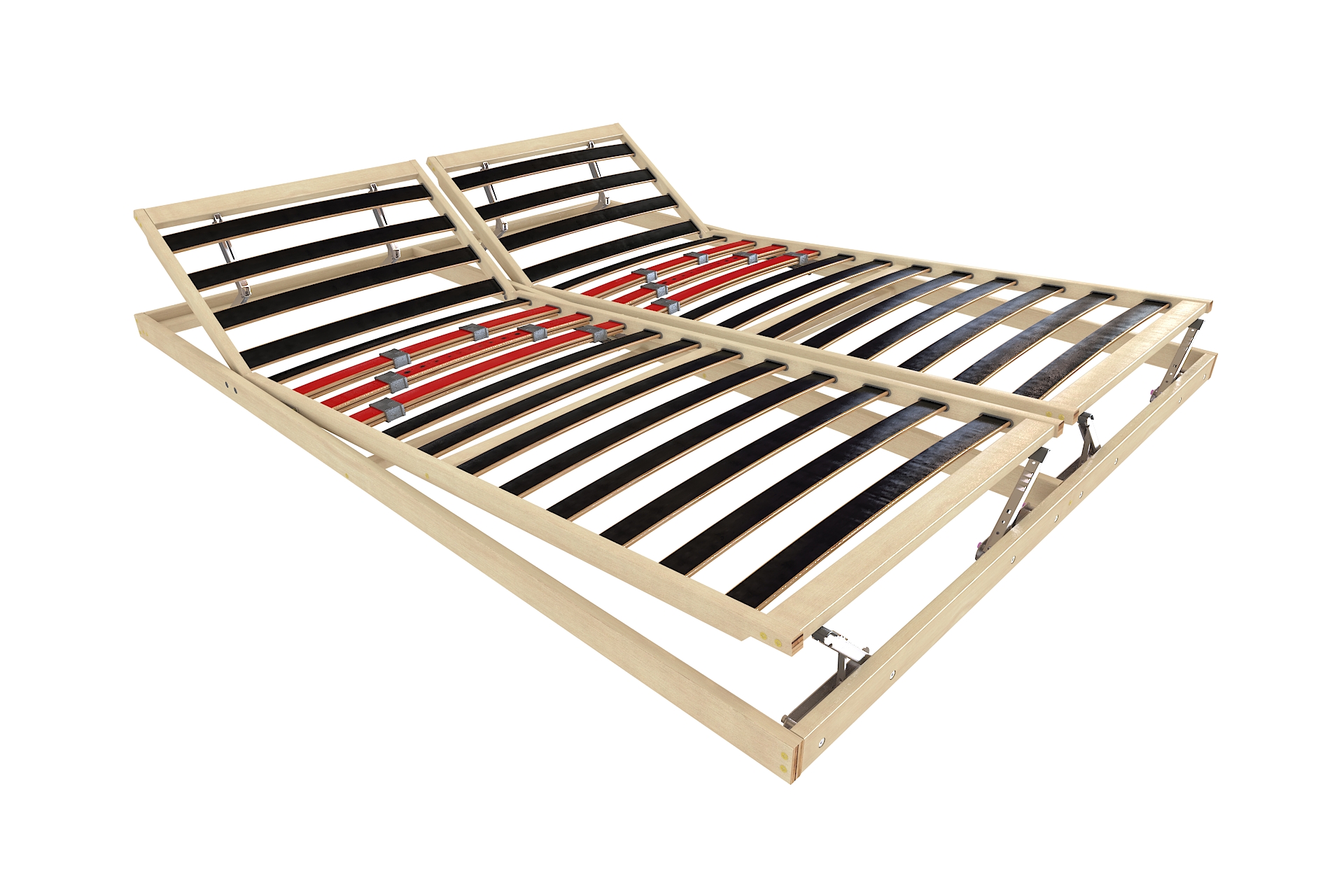 Опция P включва три двойни ламели в лумбалната зона с плъзгащи се регулатори за настройване на твърдостта. Тази система позволява оформяне на по-мека или по-твърда зона според индивидуалните нужди, подпомага правилното позициониране на гръбначния стълб и подобрява общия комфорт. При двойни рамки всяка страна може да бъде регулирана независимо.